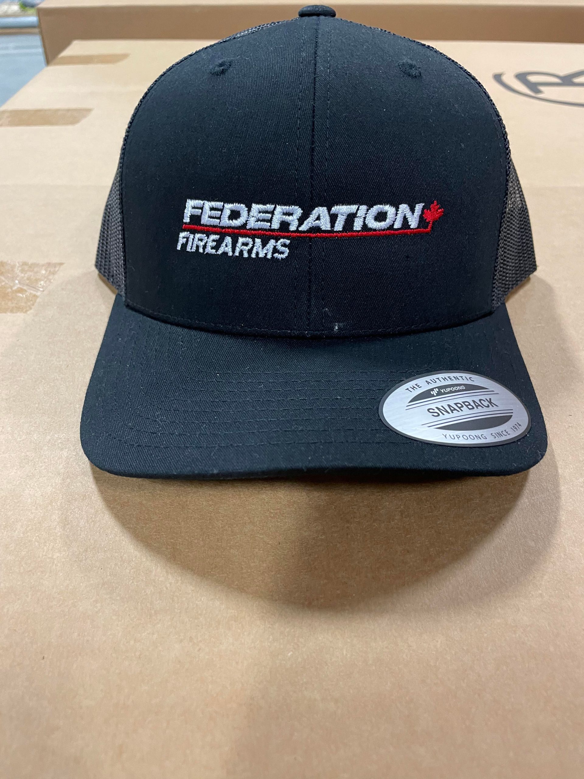 Federation Firearms black trucker hat with embroidered logo, one size fits most