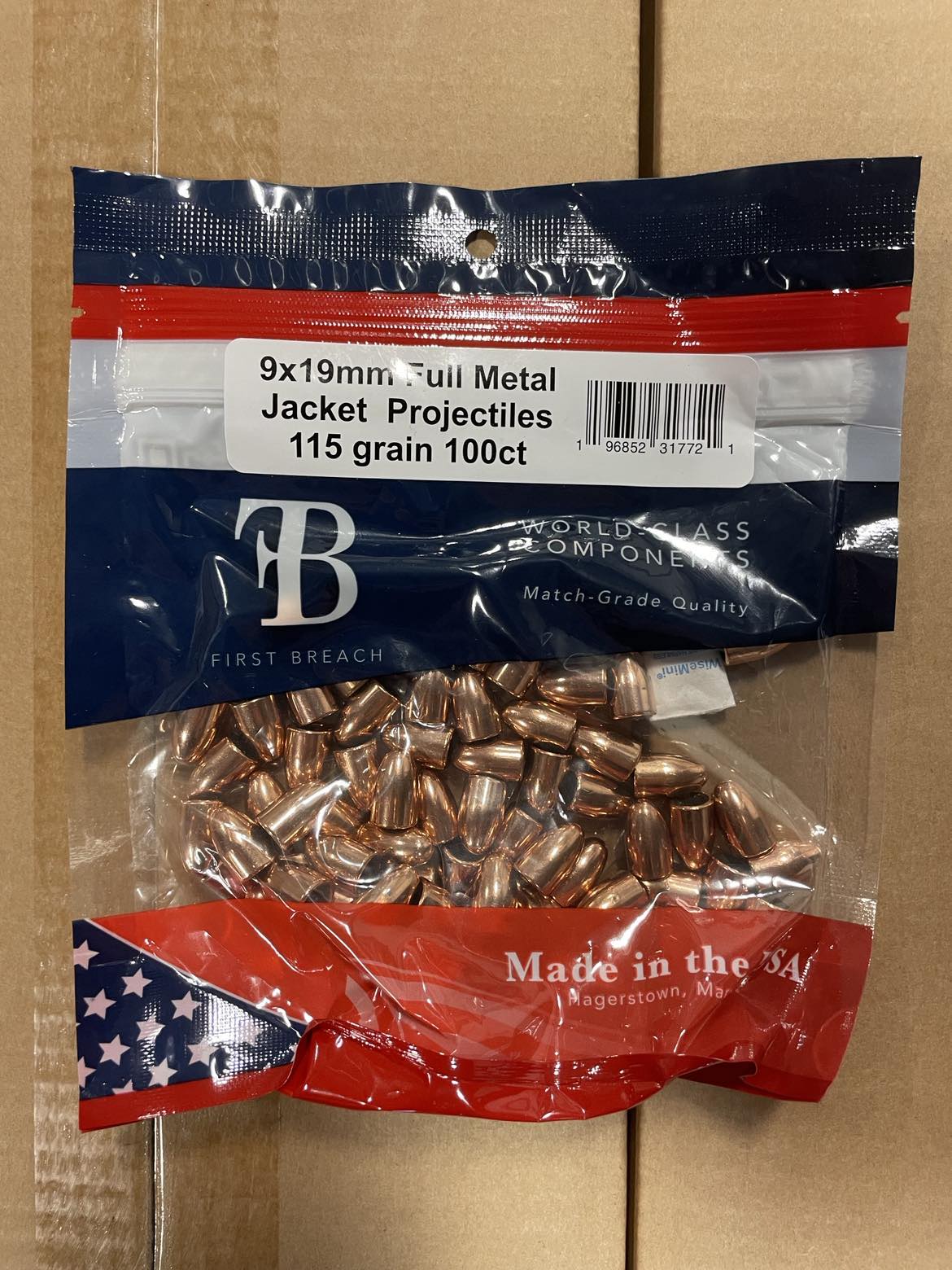 9x19mm match-grade 115gr FMJ projectile, lead core w/ copper jacket. 100 Count. Made in USA