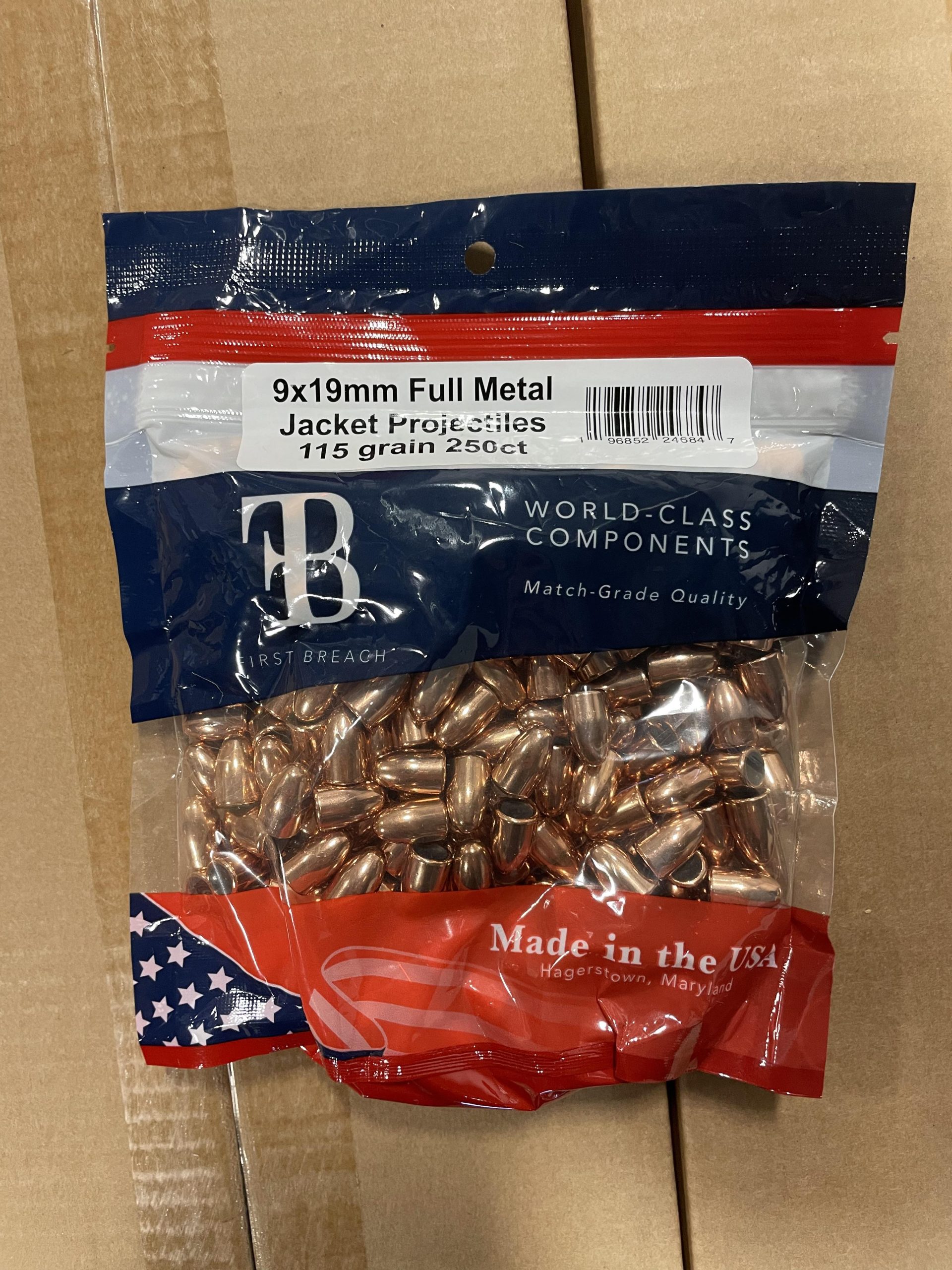 9x19mm match-grade 115gr FMJ projectile, lead core w/ copper jacket. 250 Count. Made in USA