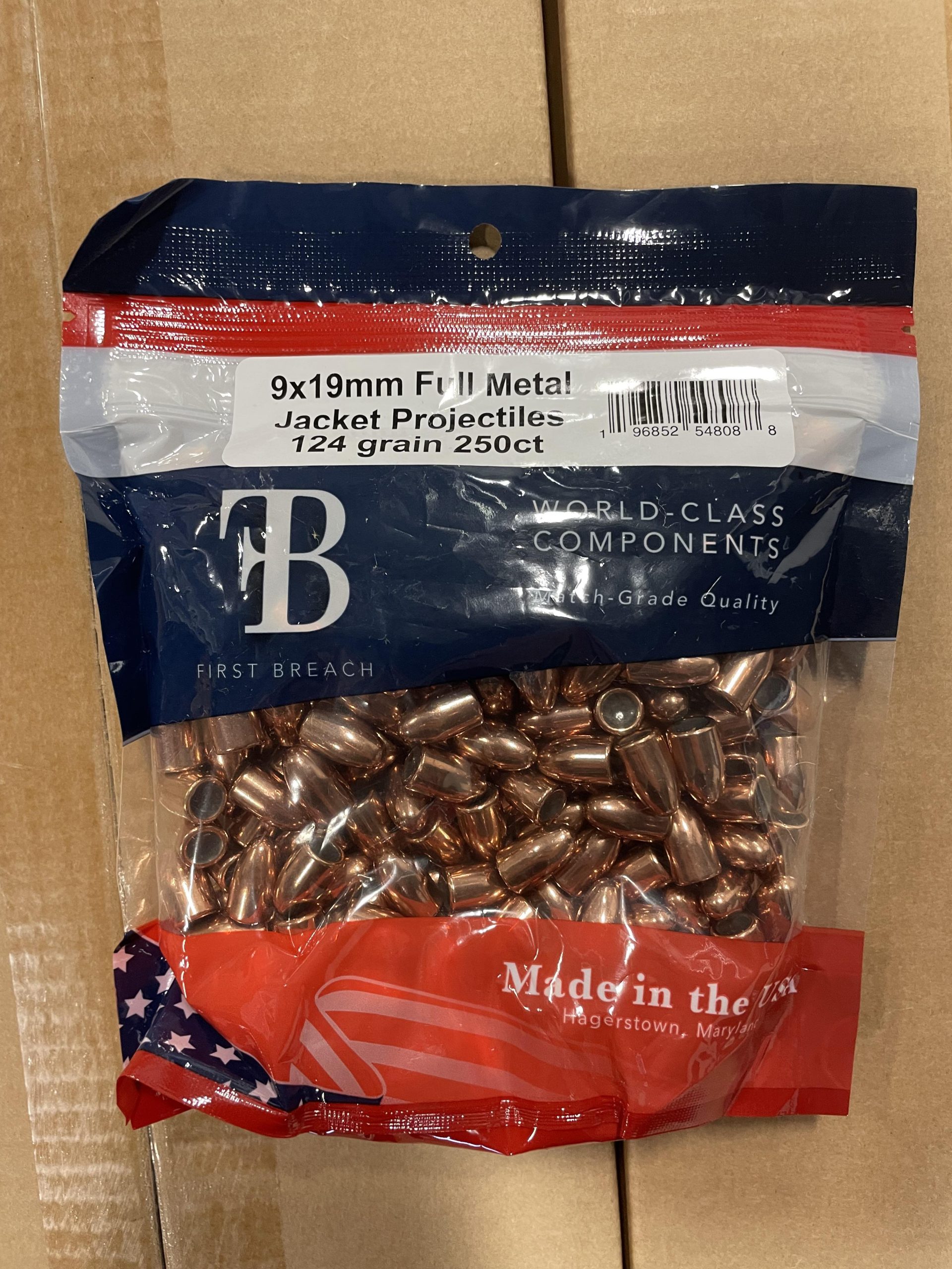 9x19mm match-grade 124gr FMJ projectile, lead core w/ copper jacket. 250 Count. Made in USA