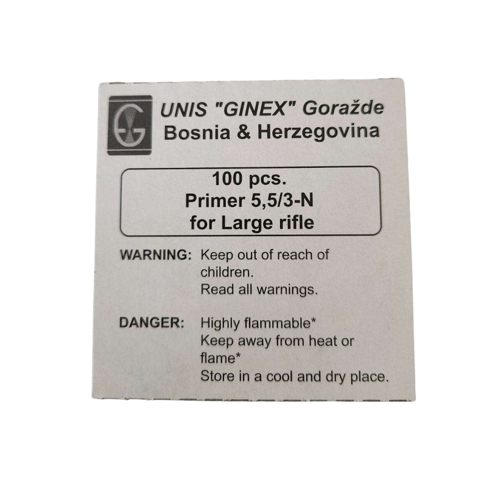 Unis Ginex Primer Cap 5.5/3-N for Large rifle, tray of 100. Made in Bosnia
