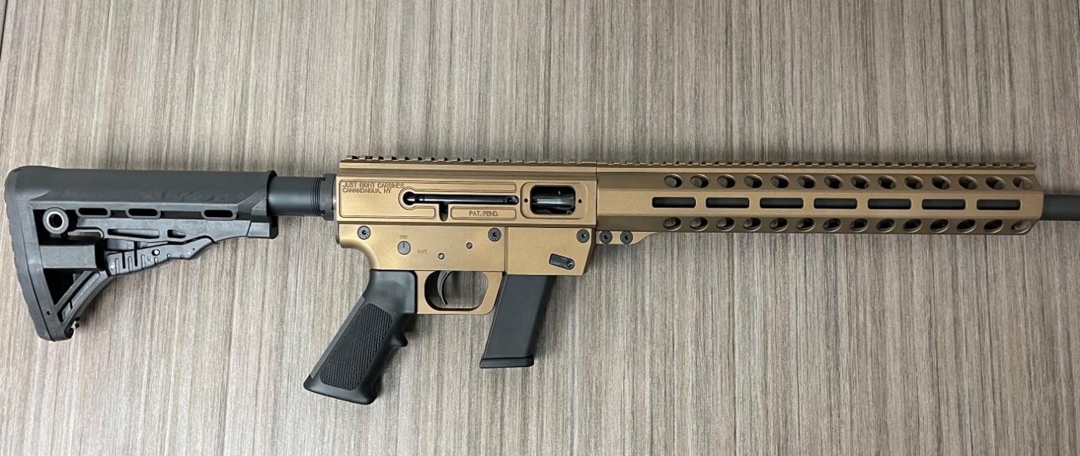 JR Carbine 9mm Gen 3 semi-automatic pistol caliber carbine, MLOK Foregrip, Burnt Bronze Cerakote, 19″ threaded barrel, 10-round Glock-Magazine. Made in the USA.