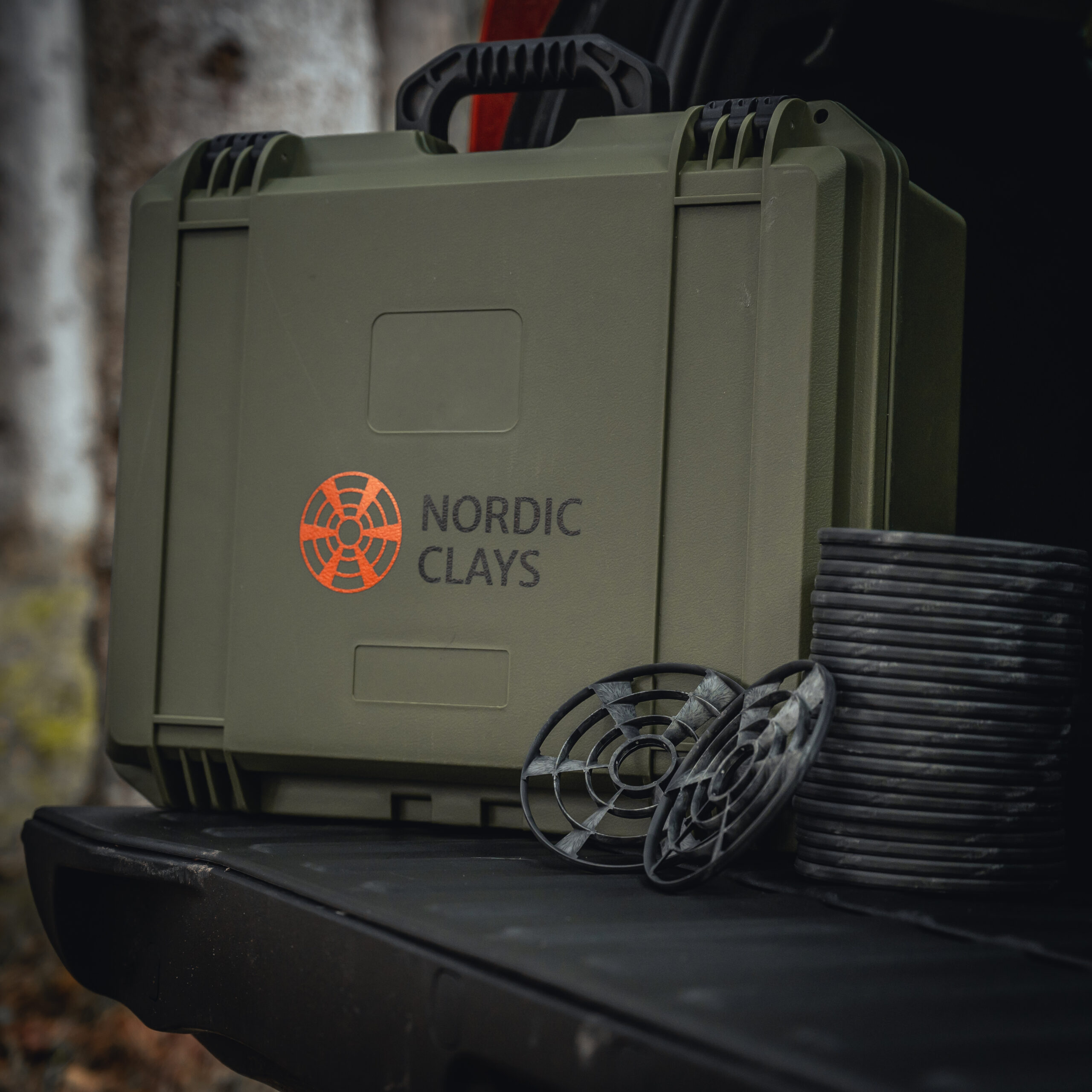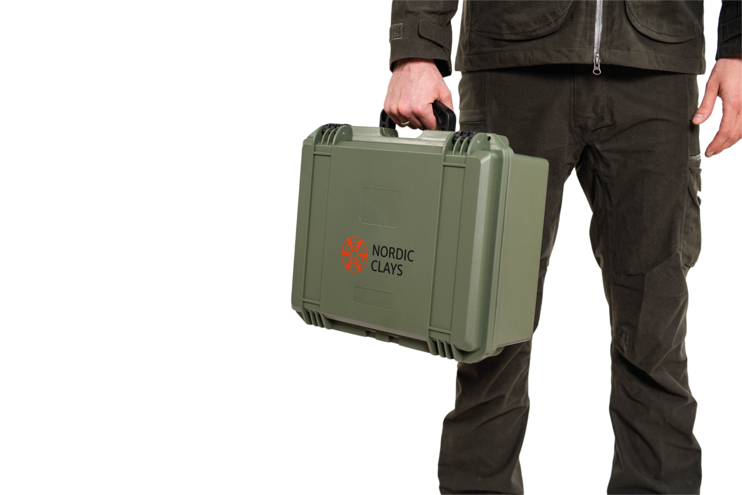 Nordic Clays Trapmaster battery-operated handheld clay pigeon thrower. Includes polymer carry case, universal wall charger, car charger, sling and user manual. Made in Denmark