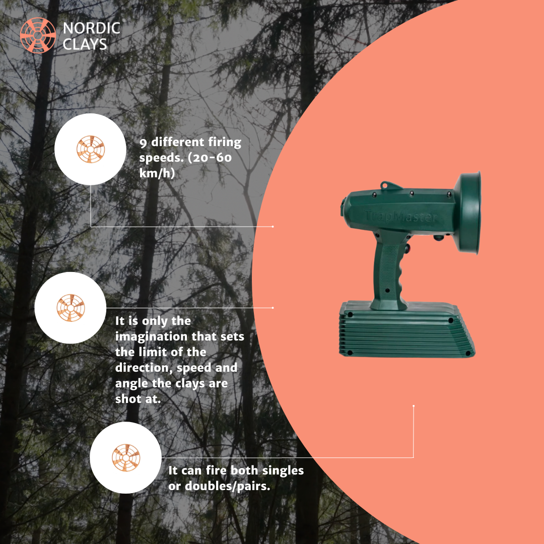 The TrapMaster is a handheld, machine-powered clay thrower, that makes it easy to practice your shooting skills, when you’re at home on your own property or out and about in the world. With its light weight of only 2 kg (4.4 lb) you can always bring it along as hand luggage.